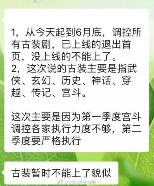 2018年开始,古装剧就成为了严格管控对象,两部大剧《巴清传》《如懿传》命运坎坷,《烈火如歌》《独孤天下》《三国机密》等头部剧集也走向了网播,2019年开年,网爆宫斗剧或全面被禁,紧接着上星播出的《如懿传》《延禧攻略》便被紧急叫停。如今,限古令显然再度升级,网爆消息显示,此次下发新规主要是因第一季度虽在对宫斗题材进行调控,但各家执行力度不够,所以第二季度要严格执行,也就是如今的“一刀切”。