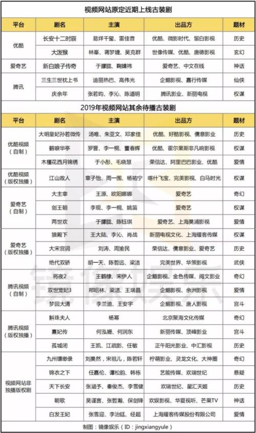 从2019年视频网站待播古装剧背后的出品公司来看,除了优爱腾三大视频网站,还包含了成立以来便和视频网站合作密切的留白影视、灵龙文化等,以及众多行业资历较深的老牌影视公司,如欢瑞世纪、新丽传媒、正午阳光、唐人影视、完美影视、唐德影视、儒意影业等。如今,古装剧最严管控的到来,又为不少还未从影视寒冬期走出的公司带来了重击。