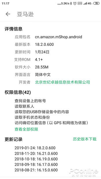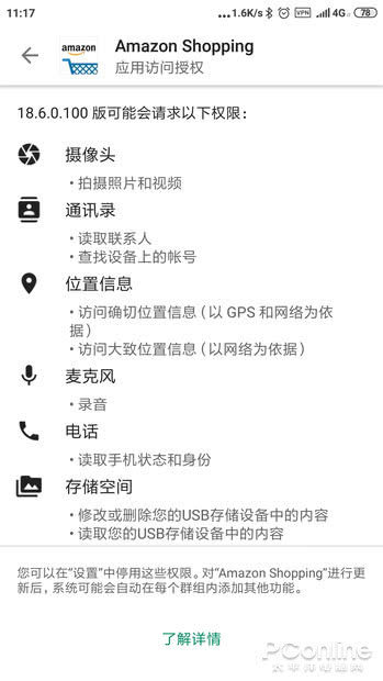 此种现象是否国产APP独有?并非如此。一些来自国外的APP,国际版本同样要比中国版所申请的权限要更少。例如亚马逊官方商城的App,在Google Play上架的版本申请了22个权限,而在中国发行的版本却足足申请了42个权限之多。