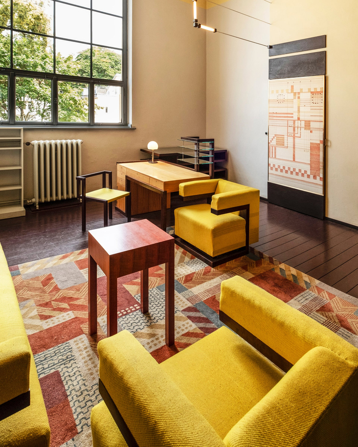 沃尔特·格罗皮乌斯反对女性吗?这个说法最近引起了不少关注,也是我最为反对的。包豪斯的招生数据显示,女生的数量往往高于男性。不过,学校的女性员工中,只有岗塔·斯托尔策尔(Gunta Stölzl)最终成为了纺织业的大师。但其他女性老师也备受尊重,在包豪斯严格但宽容的气氛中,格罗皮乌斯创造了一个让每个人都有发挥余地的环境。玛丽安娜·勃兰特(Marianne Brandt)、玛格丽特·威登汉(Marguerite Friedlaender-Wildenhain)、安妮·阿尔伯斯(Anni Albers)都是很好的例子。阿尔伯斯最近在伦敦泰特现代美术馆的展览,给许多人带来了启示。她说,在包豪斯接受的训练给她提供了目的和方向感。奥斯卡·希勒姆尔的名作《包豪斯楼梯上》(Bauhaustreppe)就展示了学校楼梯上熙熙攘攘的短发学生,展现了包豪斯的女性友谊。