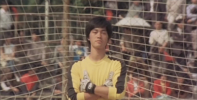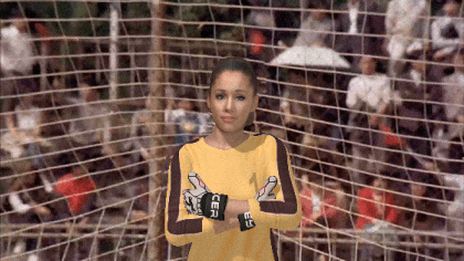 高马尾的爱莉安娜·格兰德妹子,也学着李小龙的样子守门: