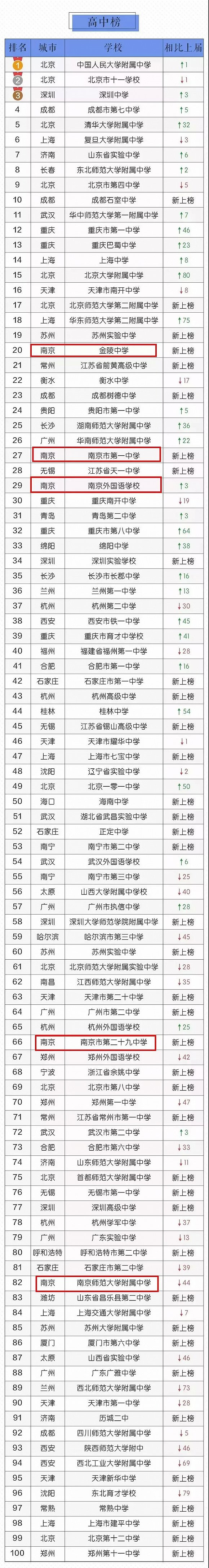 金陵汇文排行17,新城中学排行30,钟英中学排行81,金陵中学仙林分校排行90!