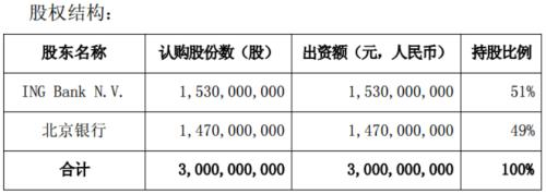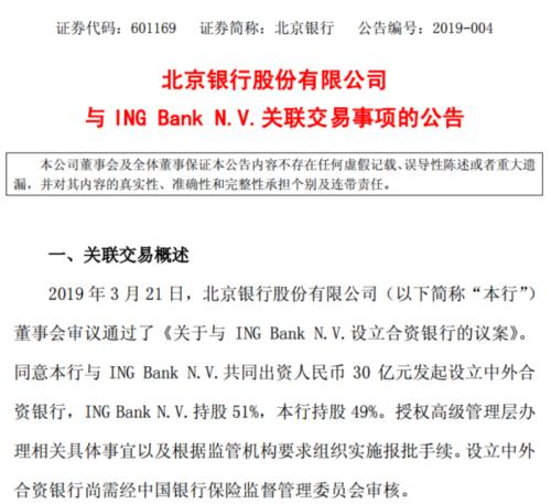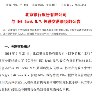 近日,北京银行股份有限公司(下称“北京银行”)发布公告称,公司拟与ING Bank N.V.共同出资30亿元设立合资银行。其中,ING Bank N.V.持股51%,北京银行持股49%。