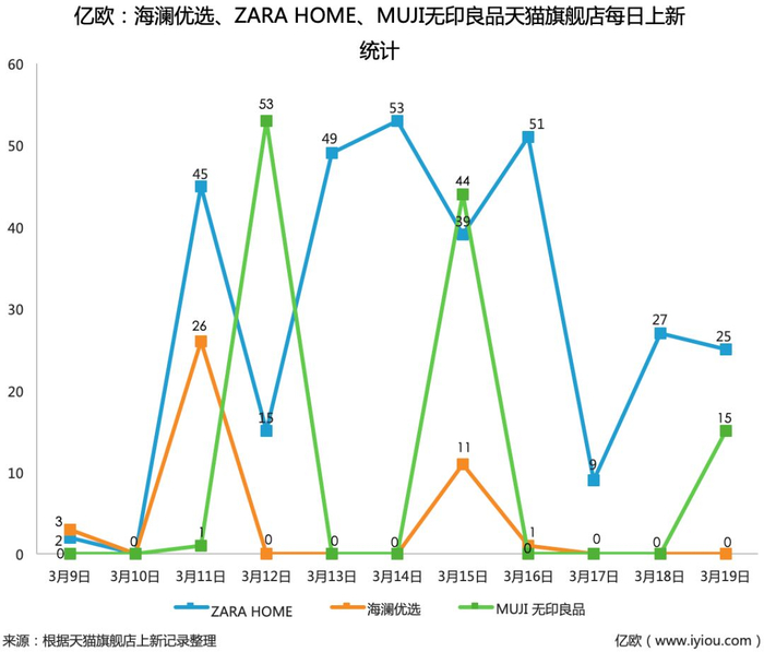 在2019年3月9日至3月19日的11天内,海澜优选天猫旗舰店共有两次较大规模的上新,新品数量分别为26件与11件;MUJI无印良品天猫旗舰店共有三次较大规模的上新,新品数量分别为53件、44件与15件;而ZARA HOME天猫旗舰店几乎每天都会更新10件以上的商品,在11天内,有5天更新的商品数量接近或超过40件。