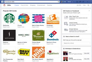 2012 年 9 月,Facebook 在美国发起了 Facebook Gifts 项目测试。这一项目基于礼品应用 Karma。Karma 是 Facebook 站内一个极受欢迎的网店。通过 Karma,用户可以为朋友购买巧克力、泰迪熊、葡萄酒、礼品卡等产品。Facebook Gifts 的具体使用步骤如下:首先,Facebook 会自动将一个包装好的礼品,发布到购买者朋友的系统墙上。朋友打开后就会看到购买者的个人信息。同时,系统也会要求他们提供送货地址。