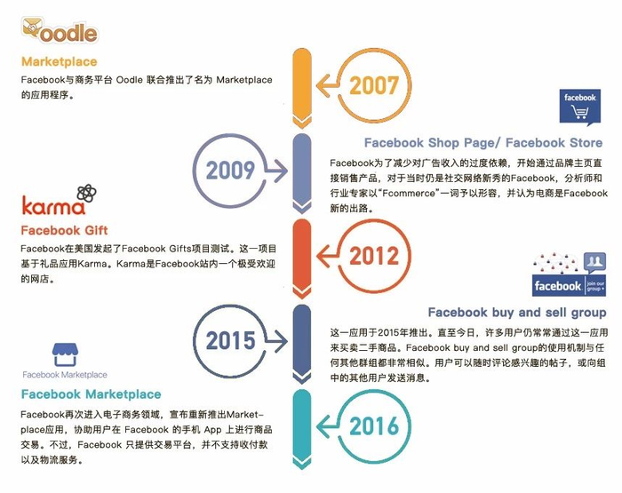 2016 年底,Facebook 再次进入电子商务领域。2016 年 10 月 3日,这一全球最大社交网站宣布重新推出 Marketplace 应用,协助用户在 Facebook 的手机 App 上进行商品交易。不过, Facebook 只提供交易平台,并不支持收付款以及物流服务。