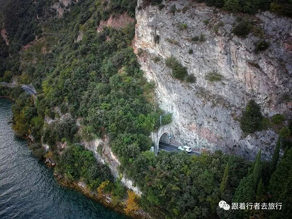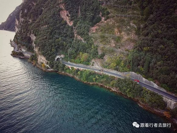 从A22高速公路下来,进入乡镇道路,车比较多,开得不快。突然,转过一个山口,才发现原来自己的车一直在高地上行驶,眼前远方出现了一个偌大的湖,而我们却在山上。沿着山路下坡,很快来到了环湖公路上。环湖公路旁基本都是峭壁,很多开凿出来的半封闭的隧道,双向单车道,限速70km/hr。蜿蜒的道路,一边是临湖悬崖,一边是嶙峋的岩壁,开着快车,好不刺激。007的追车场景在这里拍摄,这里因此也成为了很多影迷和驾驶爱好者飙车的胜地。