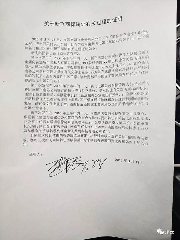 涉案商标转让情况的说明,签字的是时任新飞集团董事长李根和时任集团办公室主任石五学。