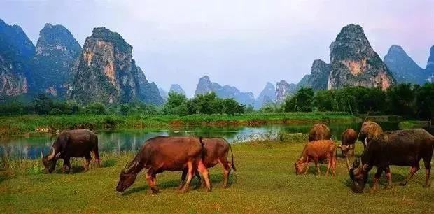 农夫荷锄,牧童戏水,黄牛岸边草,风光俊朗清逸,像极了南国田园风光,一眼望去,眼光皆是绿色。在绿色的之中,到处点缀着情态各异的山峰。