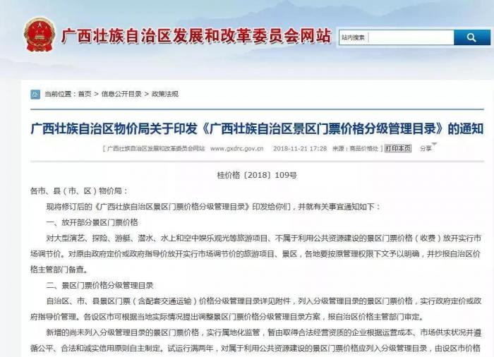 优惠内容:《广西壮族自治区景区门票价格分级管理目录》正式印发。2019年1月1日起,列入目录的景区门票将实行政府定价或指导价管理,其中不少景区标明为免费开放!
