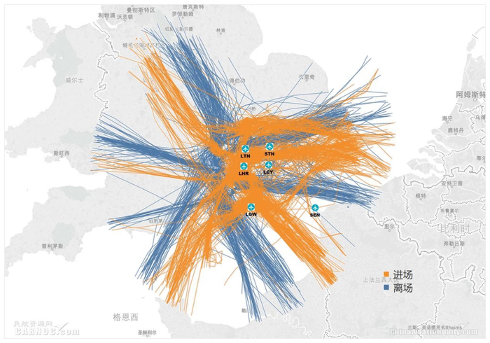 图:伦敦机场群进离场航迹示意图