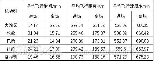 对于国内外五大机场群,进场阶段普遍更为曲折,平均进场飞行时间和飞行距离均大于离场,而进场时的平均飞行速度也远远小于离场。离场阶段由于实施统一协调放行,虽然可能在本场地面延误较大,但放行后运行流程相对更为顺畅,离场航班能够尽快爬升至高高度层脱离本场。