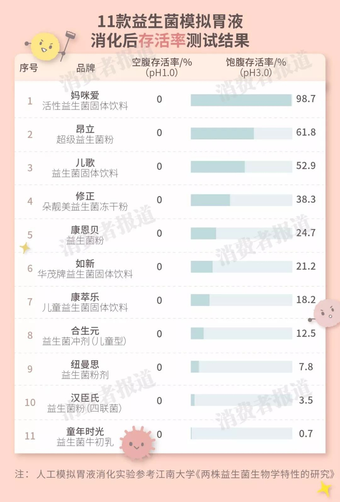 检测结果显示,模拟空腹胃酸消化后,如新、妈咪爱、童年时光等11款益生菌产品的存活率均为0,即是没有一款益生菌能活着进入肠道。
