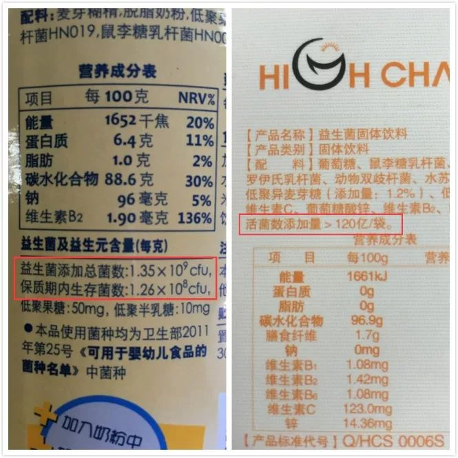 比如某些产品会使用一些转换单位的隐蔽手法“夸大”活菌数量。比如,“活菌量>100亿/100g”、“10亿/盒”等。