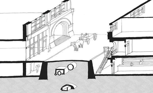 这个方案可谓一石三鸟:其一,抬高街道,可解决抽水马桶倒灌,以及市中心被海潮淹没的问题;其二,可以利用隔墙之间的空间,敷设包括排水系统在内的现代市政管网;其三,可以削减市中心周边地区陡峭山体的坡度,改变市区的地形,使其有更多平坦的用地。