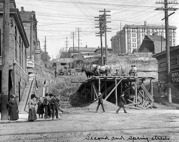 1906-1907年,西雅图市中心街道提升计划实施过程中,Spring街交叉口的坡度调整