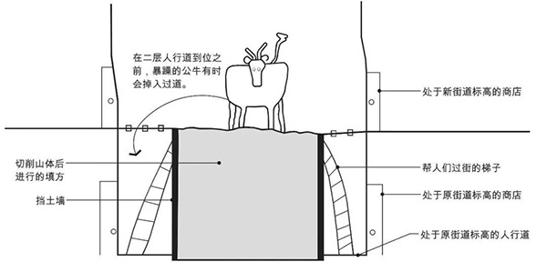 在商户重建的过程中,城市逐步完成了沿街建筑间的填高计划。但不幸的是,城市在街道上修筑挡土墙并完成填方后,就已经将资金用尽,而二层的人行道,则因资金短缺而无法建设。