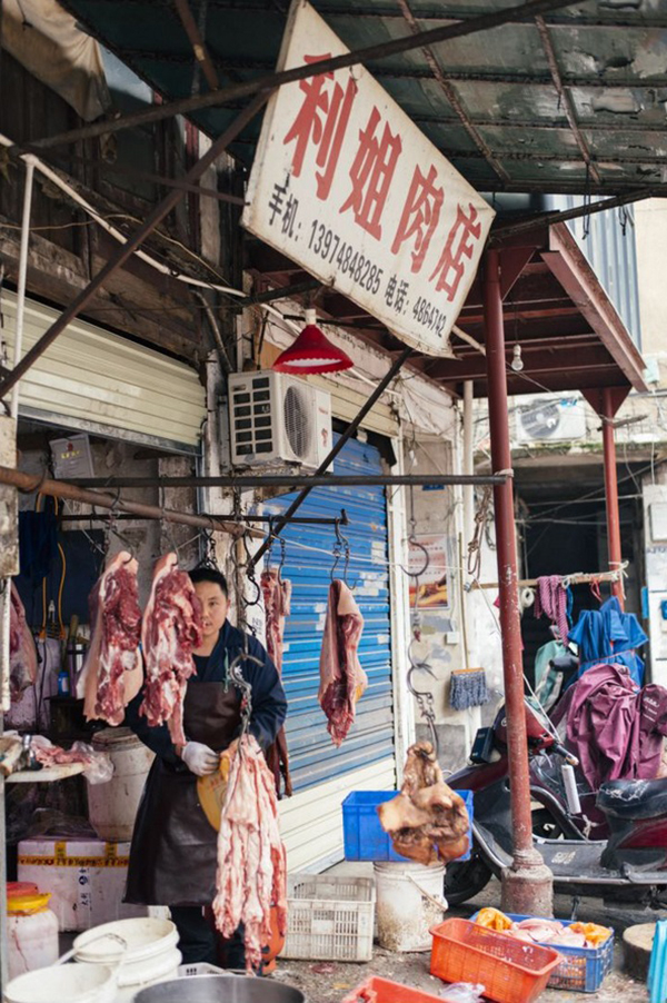 我从湘江东岸的开福万达广场背后钻了出来,穿过小巷,来到一片焦黑的街道——长沙的春雨闻名全国,在阴雨不停的季节里,整条街面都没有干过。打头的一条街叫做永兴街。永兴街上的西长街大市场售卖各种干货,夜晚的时候,像照片中泛着绿光的台北市集。小旅社的招牌将门前的街映成了紫红色,过路人的脸也是红色的。