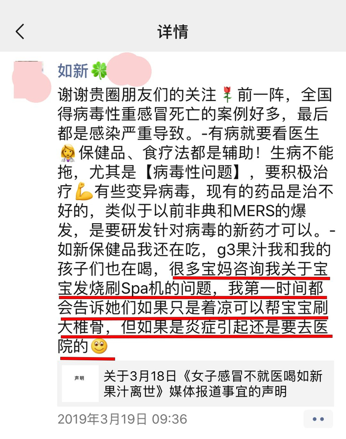 林丽也曾坚持在小孩子发烧时用如新spa机疏通经络,认为无需吃药,3月21日,《消费者报道》联系上苏伟,他告诉本刊,spa机的概念类似于中医刮痧术。本刊调查发现,如新的事业伙伴确在力推spa机,直至上述事件发生后,一名如新事业伙伴在朋友圈发文称“很多宝妈咨询我关于宝宝发烧刷spa机的问题,我第一时间都告诉她们如果只是着凉可以帮宝宝刷大椎骨,但如果是炎症引起还是要去医院。”由此亦可看处,如新自上而下确有宣传spa机可治发烧的事实。