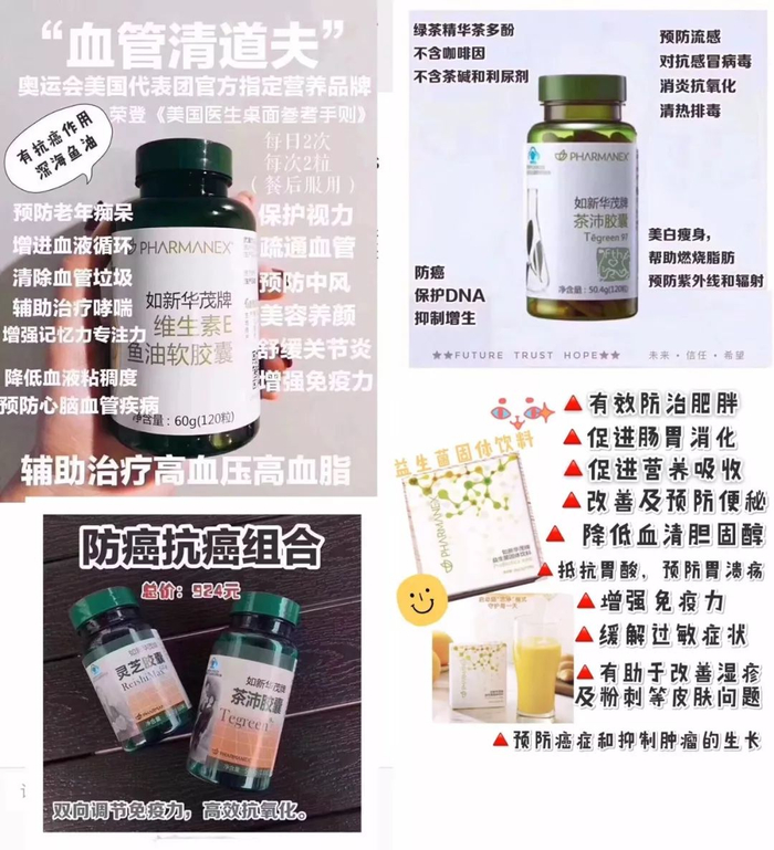 在如新事业伙伴的朋友圈可看到部分产品有防癌抗癌等暗示治疗效果的宣传:如新的牙膏与常见牙膏不同,不含致癌的胶质粘合剂,配图视频为将如新及其它品牌的牙膏分别涂抹在手背上,静待如新牙膏“被吸收”以证实它不含“致癌”胶质粘合剂;如新的益生菌固体饮料可预防癌症和抑制肿瘤的生长等;如新的维生素可以清除血管垃圾、预防中风等;茶沛胶囊能防癌等;如新的益生菌可以调节宝宝肠道、防过敏等。