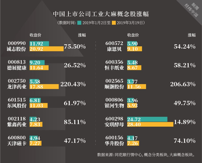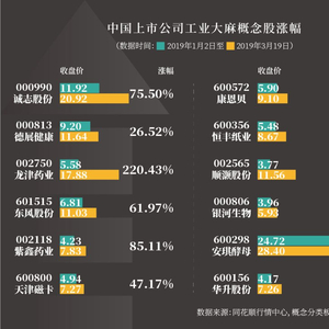 原本主营业务是数据卡的天津磁卡(600800),1月2日至今,涨幅将近50%,原因是天津磁卡间接参股了一家工业大麻种植销售公司;原本主营业务是环保包装材料及印刷业务的顺灏股份(002565), 在子公司获得《云南省工业大麻种植许可证》后,同期内涨幅超过了200%;安琪酵母(600298)股价大涨也与工业大麻概念相关,但原因有点一言难尽:2月27日,学术杂志《Nature》发表文章称酵母可产生大麻素,然后安琪酵母股价就涨了……