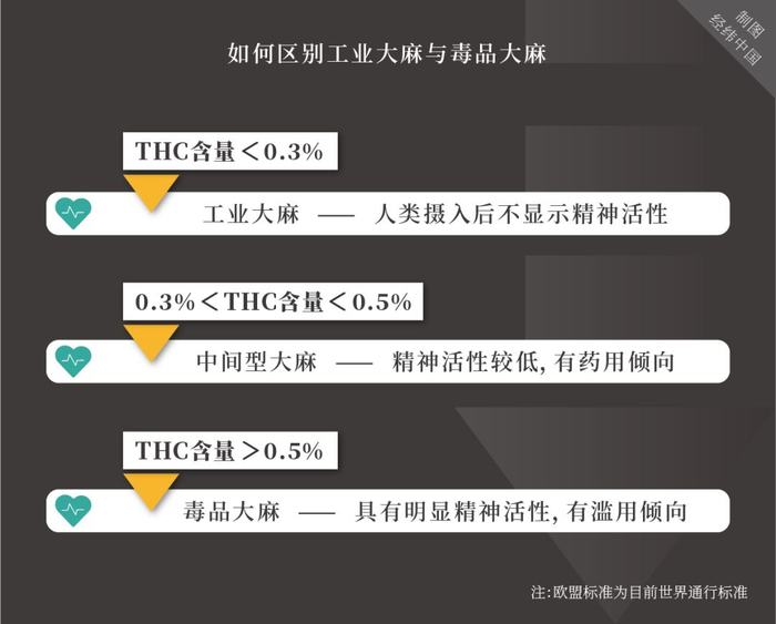 大麻可以分为工业大麻、毒品大麻和中间型大麻。这些品种之间的主要区别,就是其含有的精神活性成分四氢大麻酚(THC)含量的高低。THC有致幻作用,国际上主要采用欧盟标准(中国也采用这个标准):