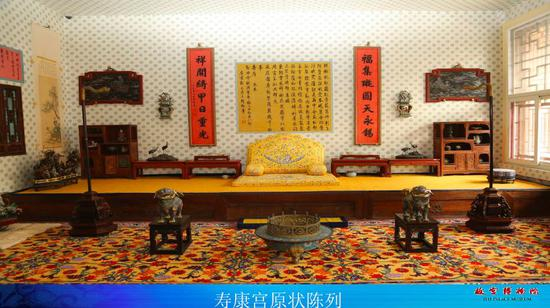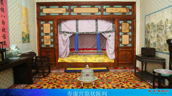 西面的寿昌宫也开放了,我们按照过去的原景重新布置起来。这是乾隆皇帝的母亲居住的地方。乾隆皇帝是一个孝子,每天早晨都会到宫里面给母亲请安,就是这个房间。