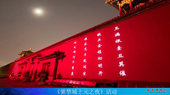 再往前面走,最长的一个屋脊上面,故宫文创馆上整幅的《千里江山图》呈现了,人们能够欣赏这样一个场景。走到神武门看到红墙上面上元灯会的诗句。