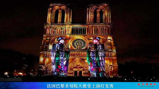 巴黎圣母院是人站在那里,看圣母院上面的墙上打出的一些色彩。