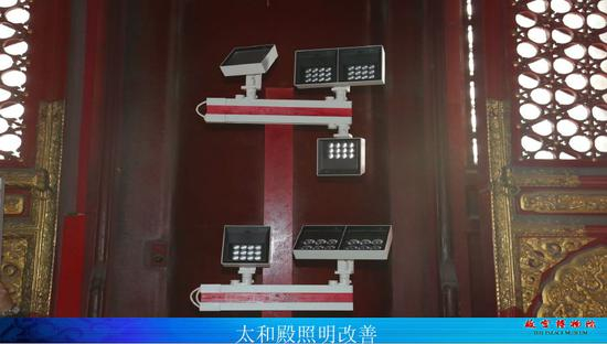 我们选择了LED的冷光源,不发热,不是一组一组灯泡,一组一组光源闪射。灯具不是挂在古建筑上,而是远离古建筑2.5米以上,用灯座固定下来,点灯的时候有两个工作人员在两边值守,用测光表反复测敏感部位的光线不能超标,不同的室内什么样的光线看着最舒服。