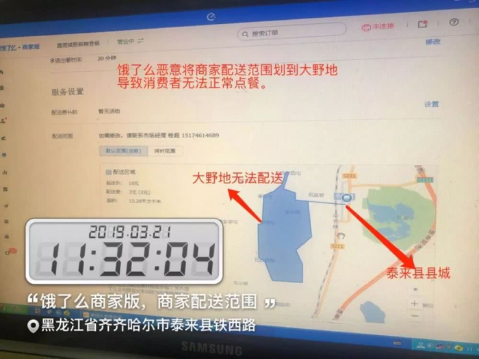 美团泰来县城市经理李鑫介绍,饿了么在泰来县除强迫商户“二选一”外,最近又采取了另一种更为恶劣的手段,将不听他们话与美团继续合作的商家不采取下线处理,而是将商家配送范围配送到荒郊野外。