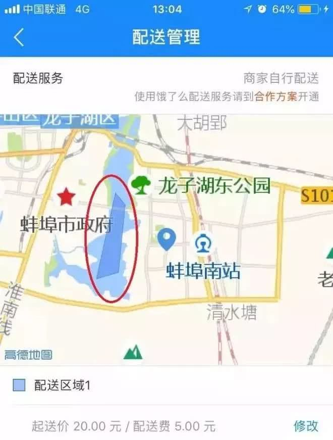 更令人吃惊的是,饿了么将安徽蚌埠的一家商家的配送区域,直接被划分到当地的一座湖中。