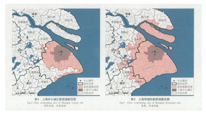 钮心毅的研究表示,将上海的嘉定、松江城、青浦、南桥、南汇5个新城,以及花桥、嘉善、苏州工业园区、太仓等长三角周边城市进入上海中心城区通勤的人数作比较后得出:嘉定与上海市中心联系最紧密,而上海市域外的花桥已经超越了市内的部分郊区,位列第三,高于奉贤、南汇、青浦。上海所在的巨型城市区域已经不是简单的圈层结构。