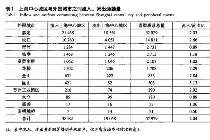 在钮心毅的研究中,通过对联通手机用户的测算发现,以上海作为中心城市、居住在上海外的流入通勤者达到10071人;而在长三角其他城市工作、住在上海的通勤者达到了6956人。考虑到联通用户在长三角地区所有手机用户中的占比,实际生活中每日来沪的长三角人总数应在4万~5万人,而上海流出的通勤者也约3万~3.5万人。
