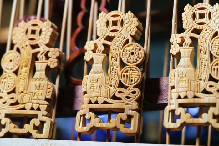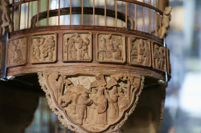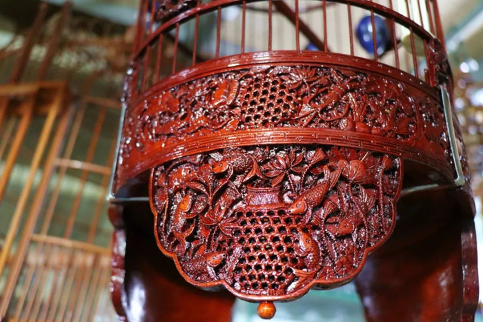 鸟笼的品质,直接可以看出养鸟人的水平和品味。它既可以素净淡雅,浑身不加一点装饰;也可以豪华繁复,在笼底板雕刻各式花纹,笼框配上木雕配饰。赖伯店中的一个鸟笼上就雕刻有“二十四孝”的故事,图案精巧又立体,看起来十分华丽。