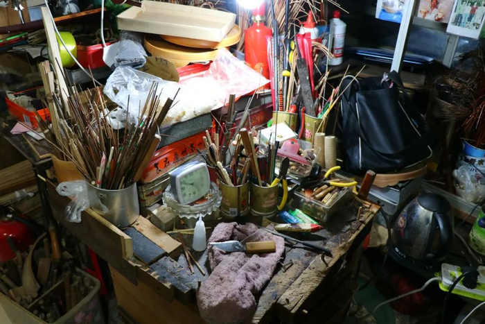 在芳村艺和广场鸟雀区,一个需要经过七拐八弯才能找到的小店铺里,赖伯正在埋头修补着鸟笼。店门口摆着一张伤痕累累的工作台,上面堆满了雕刀、手锯、拉条板、老虎钳、竹丝、木条等工具和材料,头顶上挂着各式鸟笼,有的被白布裹起,不时还能听到里面传来一声清脆的鸟鸣。这间略显狭窄、不起眼的店铺,就是赖伯平时制作、修补鸟笼的地方。