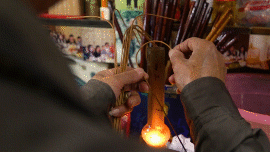 如果有地方不“正”,那就需要调整笼丝的形状。这时候,赖伯就会点亮煤油灯,然后把笼丝紧贴灯口,移动适当的位置,笼丝便会弯曲成一个完美的角度。这煤油灯的火候和分寸,赖师傅通过这近七十年的摸索,早已经熟烂于心。