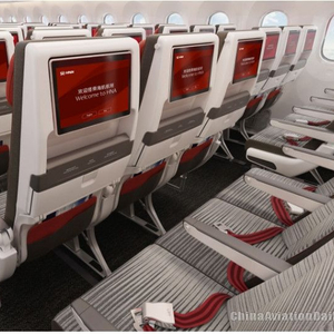 “梦之羽Dream Feather”客机首次引入超级经济舱,打造全新三舱布局。以“梦想金”为主色调的商务舱沿用行业主流1-2-1反鱼骨布局,座椅甄选高端座椅品牌Rockwell Collins 的Super Diamond,间距升级至最佳反鱼骨座椅间距46英寸,宽敞独享区域、五处储物空间、轻柔氛围灯光下闪动的金色纱线,彰显尊贵奢华质感;轻盈、时尚的“国际灰”超经舱,至享四向头枕、七度座椅后仰,配合IPAD支架,独享个人电源插头和USB充电口,方便轻松开启智慧出行;经济舱配备“行业网红”Recaro CL3710座椅,七向调节专利头枕,搭配人体工学的腰部支撑座垫,上书报袋设计, 释放“1英寸+”的腿部空间,合力打造舒适乘机体验。全舱采用情境灯光,灵感来源于河水与日月交相辉映的自然色调,在不同时段都为旅客营造光影流转的自然和谐之美。