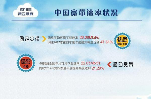 宽带发展联盟日前发布的2018年第四季度《中国宽带速率状况报告》显示,2018年第四季度我国固定宽带网络平均下载速率达到28.06Mbps,同比提升9.05Mbps,年度提升幅度达到47.6%。移动宽带用户使用4G网络访问互联网时的平均下载速率达到22.05Mbps,同比提升21.3%。我国宽带网络提速工作成效显著。