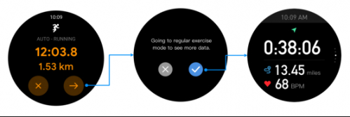 比如小编饭后习惯没事跑个20来分钟锻炼下,TicWatch C2内置的 TicMotion灵动功能,可在运动开始后3~5分钟,自动识别出用户所正在进行的运动类型,实时记录跑步与骑行运动数据。