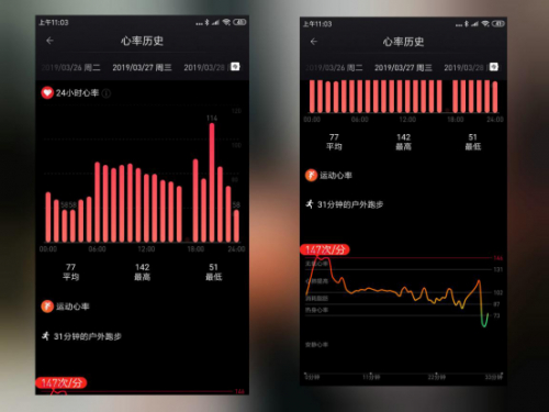 下滑页面,可查看一天下来详细心率柱状图,柱状图往下滑动,还有关于心率的各项详细数据,这样能更加直观查看一天下来的心率变化。