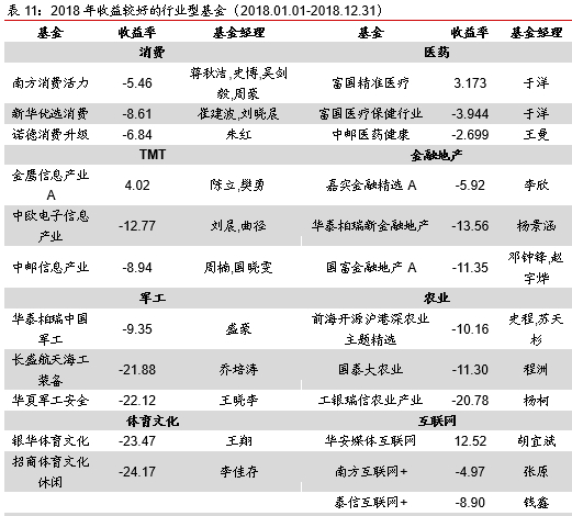 2018年所有行业主题型基金收益中枢均为负,其中收益相对较好的三个行业主题分别是金融地产、医药和一带一路,收益率分别是-14.54%、17.83%和-18.24%。收益中枢较低的三大行业分别是TMT、新能源和环保,收益率分别是-27.48%、-26.15%和-24.1%。但与指数相比,环保行业、体育文化行业和一带一路主题超越行业指数较多,超额收益分别是14.89%、12.31%和9.51%。