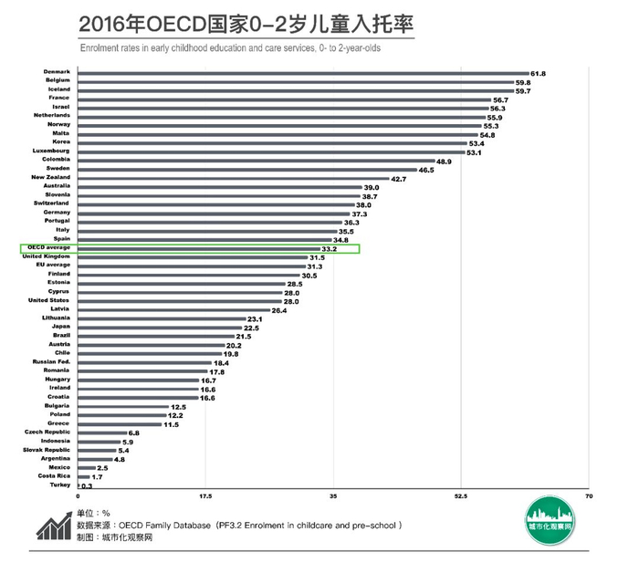 根据OECD Family Database的数据,2016年OECD成员中3岁以下儿童入托率平均值为33.2%。有10个国家3岁以下儿童入托率超过50%,其中最高的丹麦达到了61.8%,比利时、冰岛、法国、以色列、荷兰、挪威等国家也接近60%;有7个国家3岁以下儿童入托率不足10%,其中最低的土耳其仅为0.3%;东亚地区的韩国和日本分别为53.4%和22.5%。