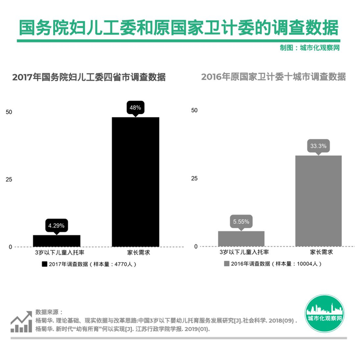 在2016年和2017年,原国家卫计委和国务院儿工委做过相关的抽样调查。其中2016年原国家卫计委在十个城市的调查数据为:33.3%的家长有需求,而调研样本中实际的入托率为5.55%。2017年国务院妇儿工委在四省市的调查数据为:48%的家长有需求,而调研样本中实际的入托率为4.29%。