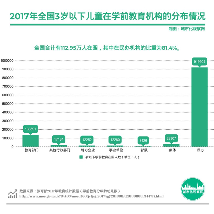 根据教育部2017年教育统计数据,3岁以下学前教育机构在园人数为112.95万人,其中在民办学前教育机构的比重为81.4%,教育部门举办的学前机构的比重为12%,集体、其他行政部门、事业单位、地方企业和部队举办的机构的比重均在3%以下。而同期全国3岁以下儿童总数约有5164万人,因此全国范围内纳入教育部门管理的托育机构在园人数占比约为2.2%。