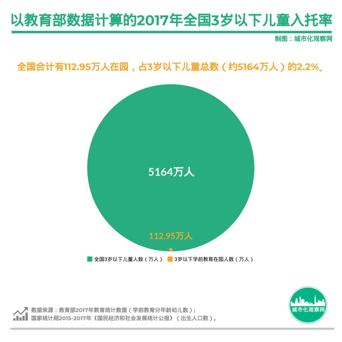 城市化观察网根据教育部和国家统计局的数据推算,全国范围内纳入教育部门管理的托育机构在园人数占比约为2.2%。