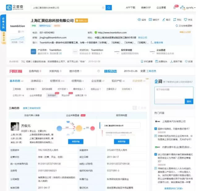 今日有媒体爆料:杭州阿里巴巴创业投资管理有限公司新增对外投资-上海汇翼信息科技有限公司,持股比例100%,该公司成立于2011年4月,注册资本705.16万元,是企业协作软件Teambition的主体公司。