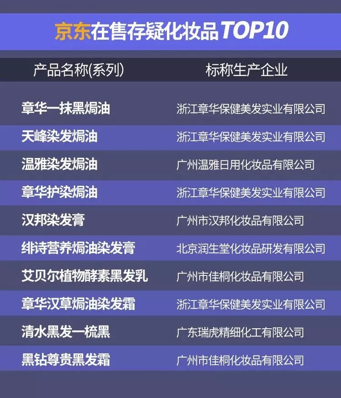 其中章华官方旗舰店的销售量最高,评价1400多条,好评率99%,但也有买家表示“过敏了,头上都是疙瘩”。根据该店网页中披露的商品批准文号“国妆特字G20161701”,其对应的“章华一抹黑焗油H(植物护理型)”2018年曾11次被通报不合格,原因是“未检出批件及标签标识的染发剂”等。在商品的规格参数中,只有京东的商品编号、产地、保质期“3年”的信息,无从判断其是否为不合格批次产品。