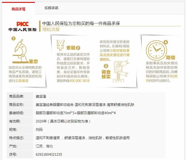 小红书、聚美、乐蜂在售的存疑化妆品数量较少,但同样未标明生产日期甚至批准文号等信息。其中,三大平台都有销售的美宝莲眼部及唇部卸妆液,去年曾有一批次被检出菌落总数以及霉菌和酵母菌总数不合格。