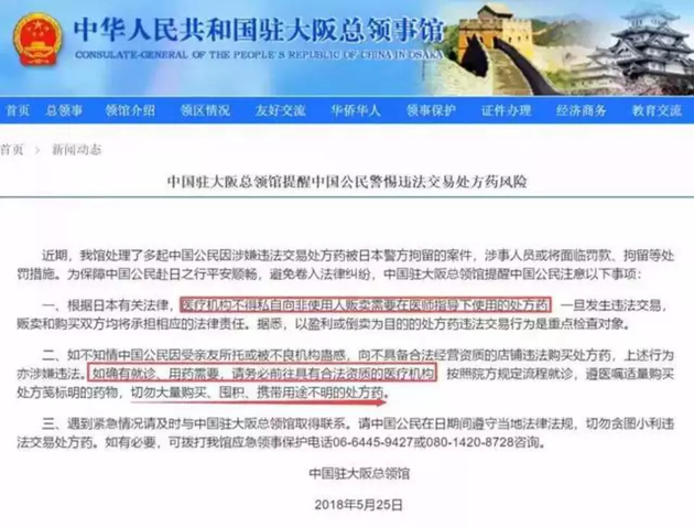 2018年5月,中国驻大阪总领事馆也发过相关声明,提醒中国公民警惕违法交易处方药风险,切勿因贪图小利而触犯日本法律。